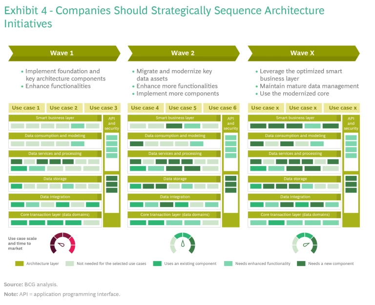 As with the data assets, companies should prioritize and sequence architecture modernization initiatives so that the first wave of architecture upgrades provides the underpinnings for a high percentage of all the upgrades necessary to enable the foundational use cases. The higher this percentage is, the faster subsequent waves of use cases can occur, enabling companies to eventually move beyond foundational use cases to differentiating use cases. (See Exhibit 4.)