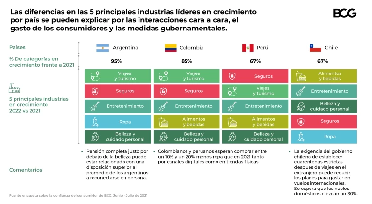 - En Colombia, las cinco industrias donde más impulso de consumo hay para el 2022 serán viajes y turismo, seguros, entretenimiento, alimentos y bebidas, y belleza y cuidado personal.