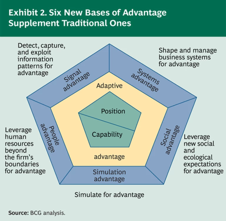 Adaptive advantage supplements—rather than replaces—strategies of position and capability. It is supported by five additional sources of advantage: signal advantage, systems advantage, social advantage, simulation advantage, and people advantage. (See Exhibit 2.) We briefly describe each below.