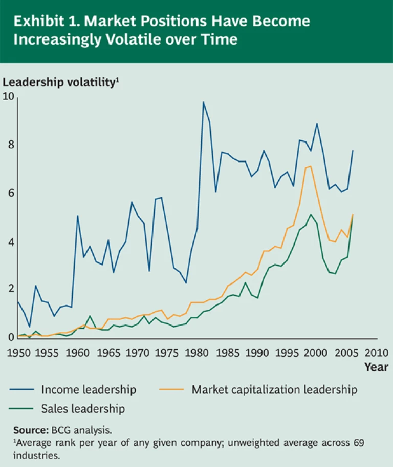 - Increasing volatility in market positions, which undermines assumptions about the durability and value of scale advantage (see Exhibit 1)