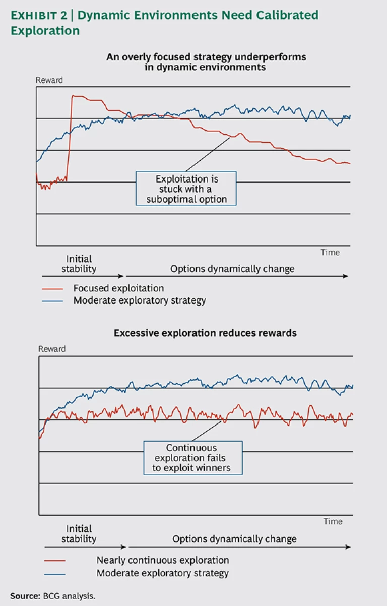 - Excessive-Exploration Trap. This is the flip side of excessive focus or pessimism. Even in highly dynamic environments, continual experimentation can lead to diminishing returns, given the (opportunity) cost of exploration and the need to recoup exploration investments with periods of exploitation. (See Exhibit 2.)
