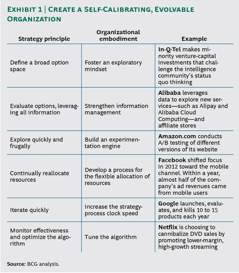To create a self-calibrating, evolvable organization, companies need to embed the “algorithm” of evolvable strategy into the “software” of their organization. (See Exhibit 1.) To do this, companies need to do all of the following: