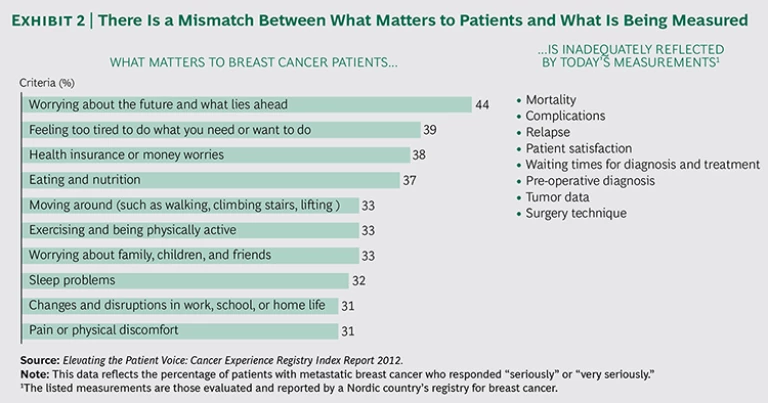 Define outcomes based on what matters most to patients. There can be a stark difference between what providers and registries measure and what patients actually care about. For example, measures of the clinical process—such as the number of admissions, length of stay, and interventions—often do not matter as much to patients as do measures of quality of life, functional ability, and emotional well-being. Exhibit 2 demonstrates the extent of this mismatch for breast cancer patients. The primary concerns for breast cancer patients are worrying about the future, being tired, and health insurance or money worries.
