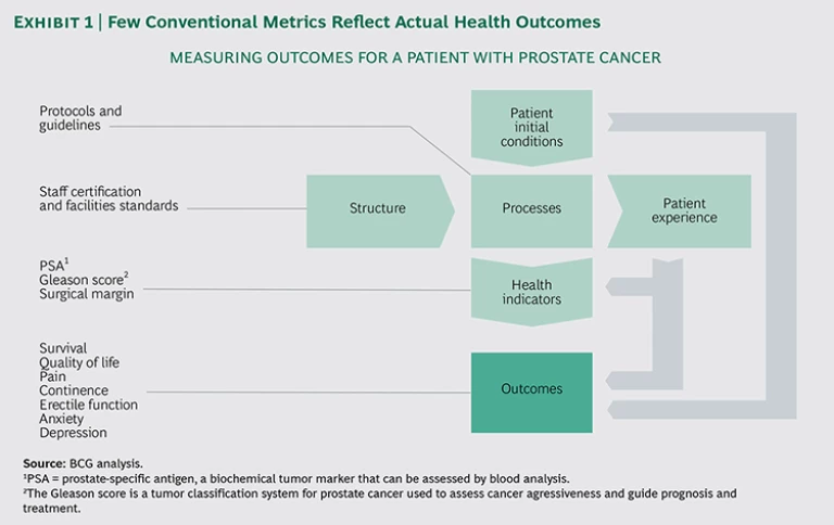 More specifically, for a patient with prostate cancer, for instance, the immediate outcomes that matter may be overall survival and progression to metastasis. But nearly 95 percent of patients survive the first five years after diagnosis, so quality-of-life issues—such as complications from surgery, pain, incontinence, and sexual dysfunction—must also be taken into account. If a tumor is small, and the patient is of advanced age, the right choice may be active surveillance—that is, not removing the tumor but tracking its progression closely. In this scenario, the patient’s anxiety about living with untreated cancer is a critical metric. These experiences highlight outcomes that can and should be measured.