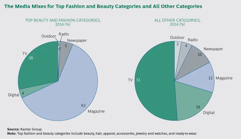 Magazines not only remain relevant but also continue to be central to fashion and beauty marketers. They receive the biggest share by far of these advertisers’ money. In more than 25 recent interviews that The Boston Consulting Group conducted with fashion and beauty marketers, media planners and buyers, and public relations executives, respondents spoke of the quality of print, luxurious advertising environment, and authority, which give magazines their cachet.