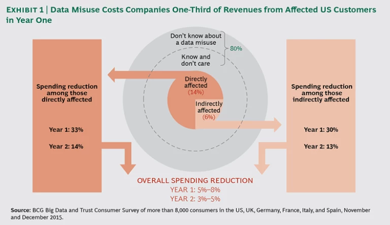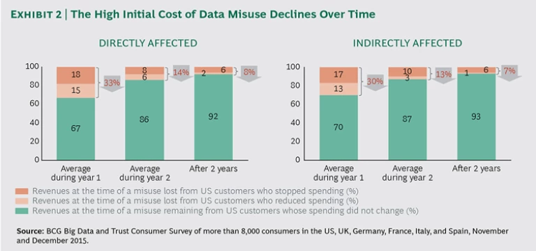 Consumers are now demonstrating that they will “vote with their feet”—stopping or significantly reducing spending—if they believe that a company has misused data about them or other consumers. As noted, this can have dramatic results: in the US, customers who are aware of and concerned about a data misuse reduce their spending by about a third in the first year. Overall, that means a 5% to 8% loss of total company revenues in the first year after these customers have stopped or reduced their spending, dropping to a 3% to 5% loss in year two. (The overall revenue loss is a function of the much larger size of the total user population.) However, as consumer awareness and concerns increase, we believe that data misuse has the potential to cut overall revenues by 10% to 25% in year one, dropping to 5% to 15% in year two. While differences exist between the US and the European countries surveyed, the potential revenue losses are comparable.