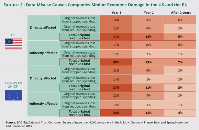 - The Geographic Area Affected. This is not a geographically isolated phenomenon. As noted above, companies experience similar levels of economic damage from data misuse in the US and Europe. More than one-third of revenues from directly and indirectly affected consumers will be lost during the first year, with the reaction slightly harsher in Europe than in the US. About one-tenth of revenues from these consumers will be lost during the second year, with differences between Europe and the US beginning to level out. (See Exhibit 3.)