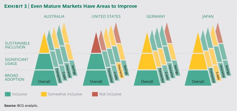 BCG’s framework is noteworthy in two important ways. First, it covers the full suite of basic financial services, including transaction, credit, insurance, and savings. These elements are integral to national and household prosperity. Second, it measures usage and sustainability, not just adoption. Adoption without usage is of limited benefit, and usage that is unsustainable—either because the offering is unprofitable or too risky for the financial institution or too costly or inflexible for the customer—can lead to personal bankruptcy and financial crises.