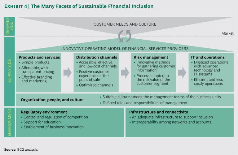 At a slightly more granular level, sustainable financial inclusion is built on a foundation of regulation that facilitates innovative services and supportive infrastructure, such as mobile networks, point-of-sale devices, and ATMs. It is, then, largely the responsibility of financial institutions to create operating models that produce desirable services and products. (See Exhibit 4.) All of these elements must come together in innovative ways to meet consumers’ needs.