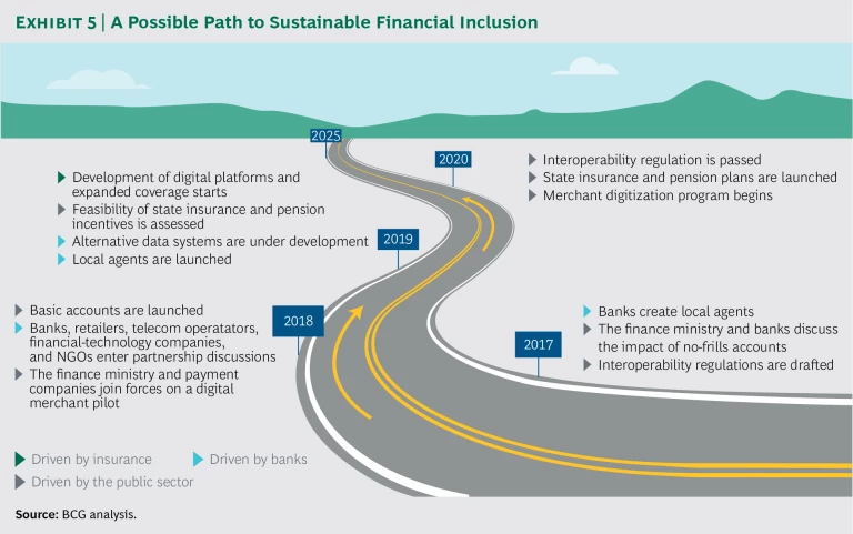 This multiyear journey will require the collaboration and support of multiple private and public parties. (See Exhibit 5.) We certainly do not have the final set of answers for South Africa, but we do have some ideas, derived from successful interventions in other countries, about how the government, banks, and insurers can improve overall financial inclusion. As a first step, these stakeholders need to join forces and decide how and where to start.