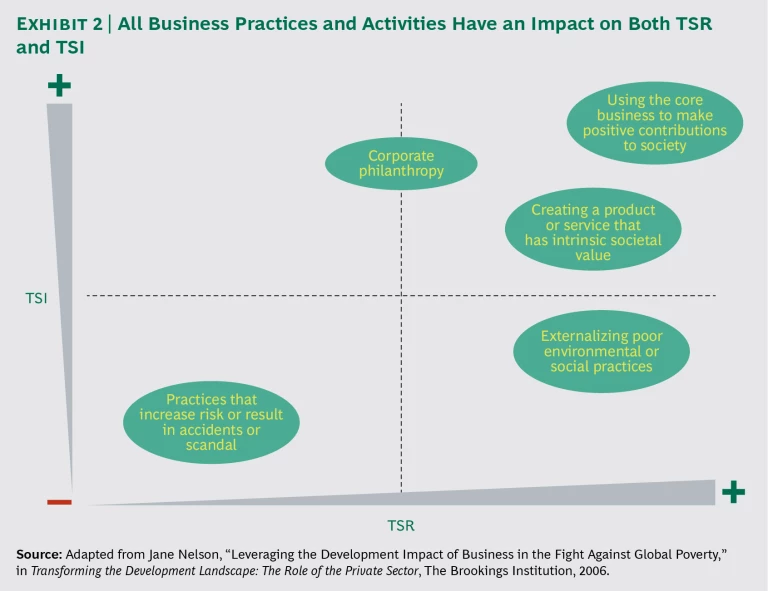 Assessing How Business Practices and Activities Contribute to TSI and TSR. A company’s business practices and activities ideally boost both TSR and TSI, falling in the upper-right quadrant. But placement within that quadrant—which reflects just how much these activities actually increase TSR and TSI—varies.