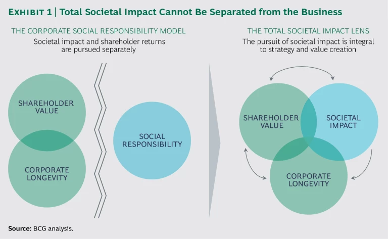 Today, it’s not enough for companies to pursue societal issues as a side activity. Instead, they must use their core business—and the scale advantages it offers—to create both positive societal impact and business benefits. The result can be a more reliable growth path, a reduced risk of negative, even cataclysmic, events, and, most likely, increased longevity. (See Exhibit 1.)