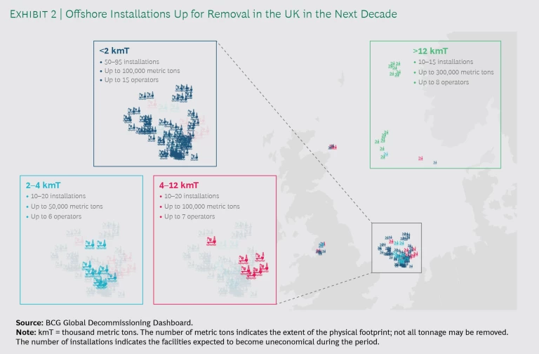 For suppliers, the opportunity is vast. For example, in the next decade, about 80 to 150 offshore installations are expected to become uneconomical in the UK alone. (See Exhibit 2.) A supplier able to tackle a single activity and equipment archetype (such as the removal of topsides weighing less than 2,000 metric tons) could access a large market, in this case up to 100,000 metric tons. To this can potentially be added the removal of the respective substructures and adjacent services. Innovative business models could help suppliers capture a disproportionate share of the decommissioning market through improved cost efficiency and longer-term relationships with operators.