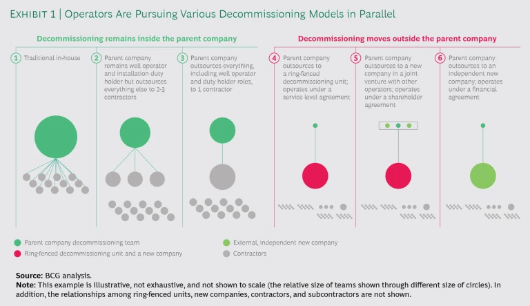 Government and companies recognize the issue. Some governments have set goals of reducing decommissioning costs by 30% or more, and operators are starting to develop plans of action. But few companies have decided on the decommissioning operating model they want to adopt, which means that they have yet to identify the skills they wish to maintain internally, the activities they will outsource, and the network of contractual relationships they will need in order to liquidate their decommissioning liabilities. And even as the industry gears up for a global wave of work that will run for the next several decades, it is still operating with multiple models in parallel. Oil and gas company shareholders and managers—along with taxpayers, who could be on the hook for as much as 80% of the bill—are looking at the prospect of billions of dollars of waste and inefficiency.