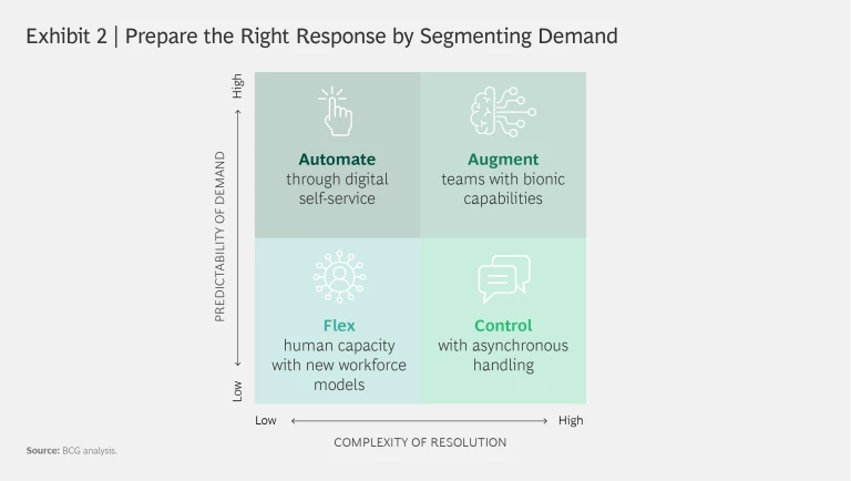 The solution is to embed structural resilience as a permanent feature of new ways of working. This requires that companies understand the nature of potential customer service requests along two dimensions: the predictability of demand and the complexity of resolution. (See Exhibit 2.)