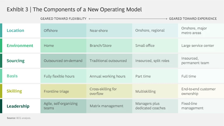 Companies need a cohesive operating model to handle the full range of possible demand in customer service operations. They must carefully select from and combine a variety of options in order to balance the flexibility needed to handle uncertainty with the experience needed to handle complexity. (See Exhibit 3.)