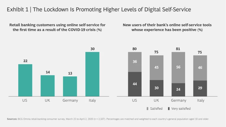 From the customer’s perspective, the closing of physical stores and branches has driven a step change in the use of remote service channels. In the US, calls to contact centers from banking customers have increased by 14%. And these customers’ use of web and app self-service tools has increased by 20%. In fact, since the crisis began, 22% of US consumers have used their bank’s online self-service tools for the first time, and 80% of them have had a positive experience. (See Exhibit 1.) Companies have been trying to persuade customers to use digital self-service for at least the past ten years, with mixed success. Now it is being adopted at unprecedented rates.