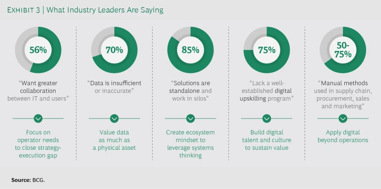 That’s a huge deficit, especially considering the enormous benefits digital technology can bring to the sector. By accelerating digital transformation, metals and mining players can boost throughput, simplify processes, lower costs, improve metal recovery and yield, and reduce supply chain complexity. It’s not easy to pull off, but a handful of companies have done it—and after a closer look at the various players in our survey, we have identified the digital accelerators that set those industry leaders apart.