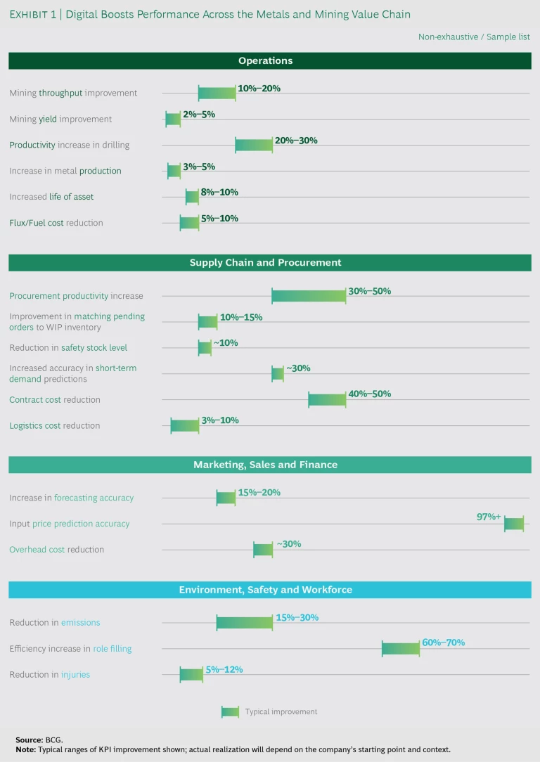 These are not insignificant challenges. But during our DAI research, we worked with several metals and mining companies that overcame these barriers in innovative ways—and, in turn, reaped significant rewards. Some improved their mining throughput by 10% to 20% and their procurement productivity by up to 50%, and reduced emissions by 15% to 30%. (See Exhibit 1.)