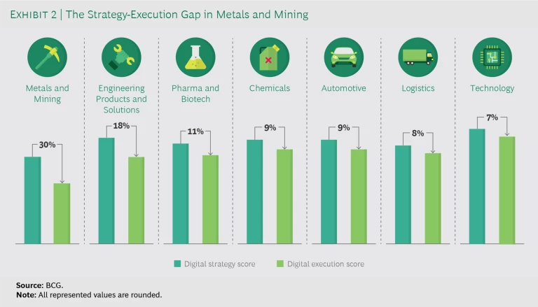 Focus on operators’ needs to close the digital strategy-execution gap. Most metals and mining companies have ambitious digital strategies in place, but the gap between strategy and execution is significant—especially relative to other industries. (See Exhibit 2.) Leaders cite three reasons for this: a lack of customized solutions, the use of traditional waterfall models instead of agile methods to deploy digital products, and an inadequate focus on a solution’s sustainability.