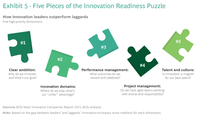 Our analysis indicates that five factors are especially important to innovation readiness. (See Exhibit 5.) These factors are where the biggest gaps between leaders and laggards occur in our i2i scoring system—indicating that they are the ones most likely to make a difference—yet they are also areas where leaders still have ample room for improvement.