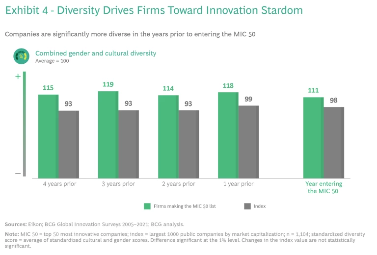 Companies in the top 50 tend to exhibit higher gender and ethnic diversity in their leadership—as shown by companies like Microsoft, Alibaba, Cisco Systems, Philips, and Novartis, which beat their peers in both gender and ethnic diversity. But which way does the causality run? Looking back at the companies that entered our top list each year since 2005, we see that they were more diverse prior to making the list than a broad index of the largest 1,000 companies. We don’t see robust evidence, though, that top 50 innovators further increase diversity after attaining a top 50 ranking. (See Exhibit 4.) This dynamic suggests that while gender diversity and cultural diversity may help foster innovation, being more innovative does not cause firms to attract even greater diversity.