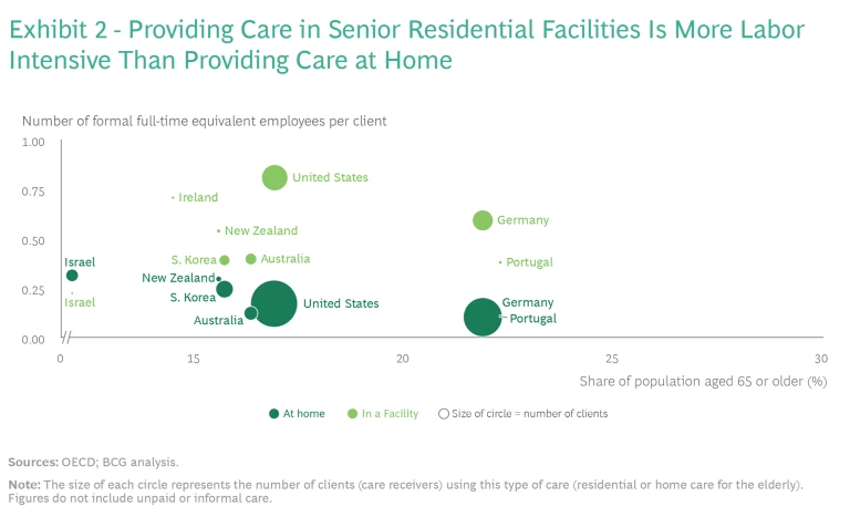 In recent years, aging in place has become an increasingly popular alternative. In contrast with the traditional route, aging in place offers blended care, in which formal staff is mixed with informal labor—the largely unpaid caretaking and housekeeping provided by family, friends, and elderly people themselves. (See Exhibit 2.)