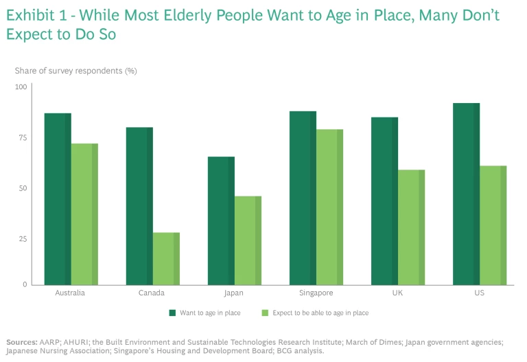 Researchers around the world have found that the overwhelming majority of elderly people prefer to remain in their existing home rather than move to a senior residence. (See Exhibit 1.) Indeed, recent studies have shown that even when contemplating a future in which they might need regular assistance with dressing, eating, or other daily functions, more than 60% of elderly people say that they would prefer to age in place if they could. But they aren’t sure they’ll be able to.