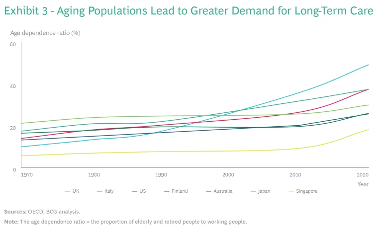 Another critical challenge is the growing need for elder care, driven by demographics and the declining overall health of the population. Currently, even during the COVID-19 pandemic, there is a shortage of facilities for senior residential care, and demand is expected to rise when the pandemic subsides. Many people who are now 65 years old are expected to live into their 90s. From 2020 to 2030, the proportion of the population over age 65 will have grown by 3%—a much greater rate than that of the overall population. And chronic health conditions are prevalent in this population. 85% of the elderly people in the US and 80% of those in Australia are affected; 37% of aging people in Singapore have more than three chronic health issues.