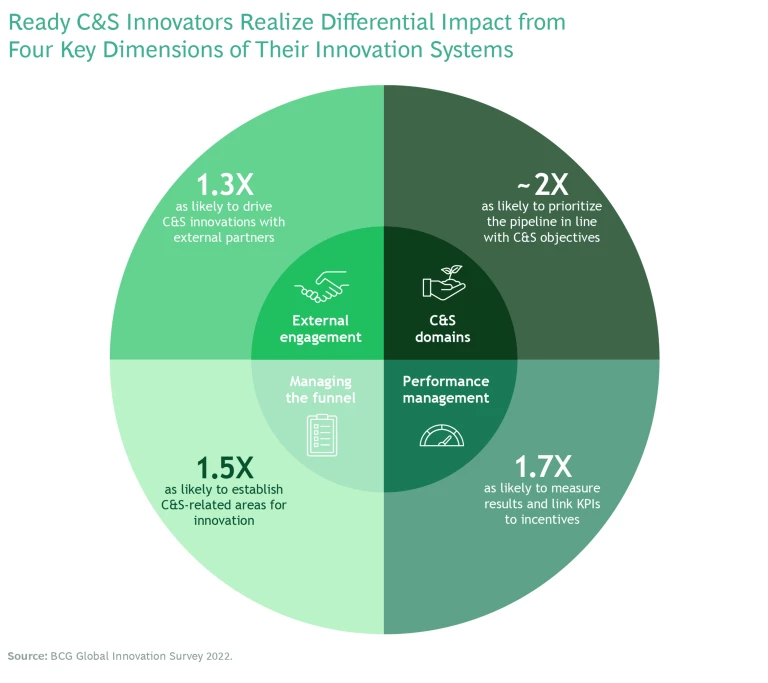 C&S-ready companies emphasize various aspects of their innovations systems more aggressively than other companies do. They start with greater ambitions. They identify the domains they want to focus on, manage the idea funnel, and have clear performance goals. And they engage more actively with partners and even competitors.
