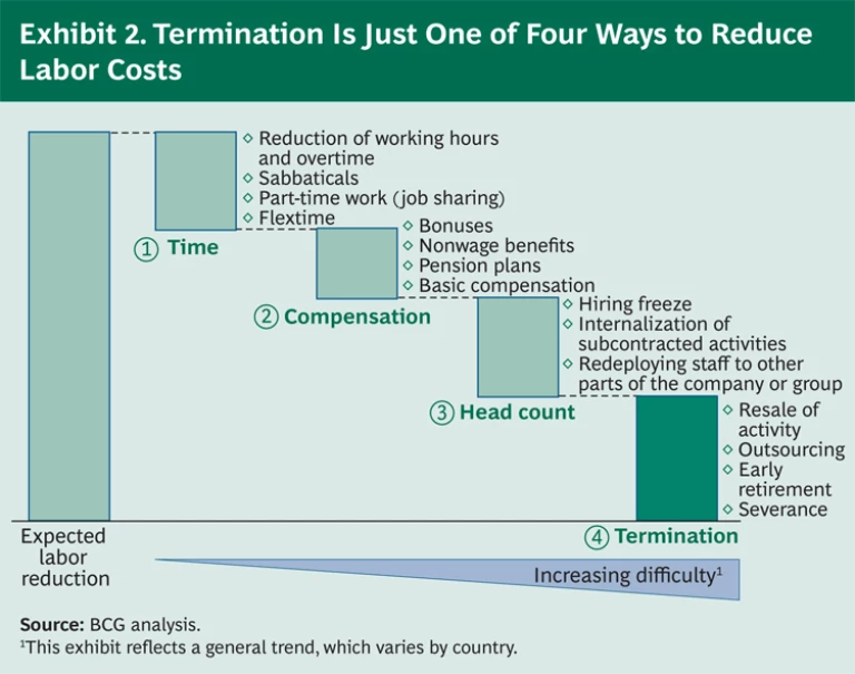For example, on the time front, labor costs can be reduced by introducing shorter working hours, part-time work (job sharing), and flextime. Different elements of compensation, including bonuses, can also be adjusted. Soft head-count measures might include hiring freezes and redeploying staff to other parts of the company or group.