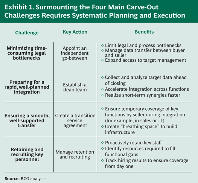 Minimizing Time-Consuming Legal Bottlenecks. The legal complexities of carve-outs are much greater than those of traditional mergers in which an entire company is purchased. Which exact parts of a business will or will not be transferred? How should the interaction between the two parties be managed to enable the buyer to prepare for the transfer without violating regulatory laws? For example, which data should be open to all and which data should be available only in a so-called clean room environment that is physically and electronically isolated from both buyer and seller? And what access will the buyer have to executives with critical relevant expertise who will not be transferring with the asset?