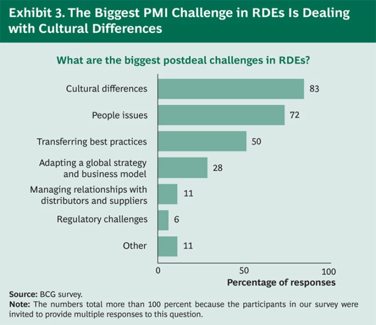 Understanding and Dealing with Cultural Complexities. Although PMI is generally considered no more difficult in RDEs than in developed markets, the challenges are not the same. Not surprisingly, the top obstacle to successful integration in an RDE, cited by 83 percent of executives in our survey, is managing the cultural differences between the acquirer and the target. (See Exhibit 3.) Cultural differences play an important role in all PMIs, regardless of the geographic location of the deal, but these differences assume much greater significance—and require much greater sensitivity—in RDEs, where mindsets can be radically different from those in developed economies. This is especially true in RDEs that have only recently opened their doors to foreign investment or in which there are distinctly different value systems. One executive singled out the problems in “changing the mindset [of the target’s management] from ‘production’ to ‘sales and marketing.’” Others said that it was difficult to get the target to accept Western best practices: “Some people perceived the processes and procedures as inefficient and time consuming.”