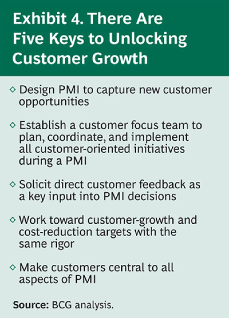 Putting customers—and growth—at the heart of a PMI requires taking five main steps: planning for growth before a deal is finalized; creating a dedicated customer-focus team; understanding customers’ expectations, concerns, and aspirations; preparing a coordinated customer plan for day one; and taking regular customer pulse checks.