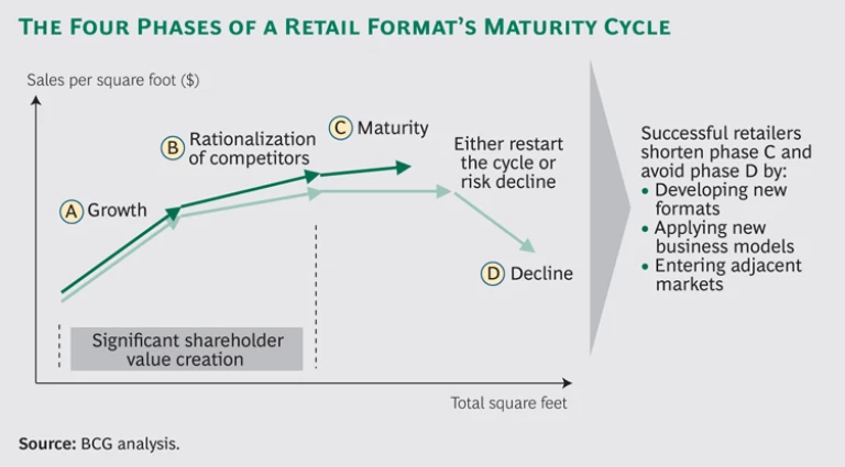 The result is a very dynamic and hypercompetitive retail landscape. The consequences are clear: retailers must accept that they will have to reinvent and adapt their store concepts over time if they are to have any chance of sustainable long-term growth. Thus, it is important for them to think through the maturity cycles of different retail formats and to implement appropriate strategies based on their current format and its level of maturity. (See the exhibit below.)