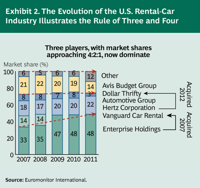 Current examples of the rule of three and four are easy to find. The U.S. rental-car industry is one. (See Exhibit 2.) In 2006, four competitors—Avis, Enterprise Holdings, Hertz, and Vanguard Car Rental—had market shares exceeding 10 percent. The March 2007 acquisition of Vanguard by Enterprise, however, gave the latter nearly half the market—and set in motion competitive dynamics implicit in the rule of three and four. In fact, the market has closely followed Henderson’s script. In 2011, the three market leaders—Enterprise, Hertz, and Avis—had market shares of 48 percent, 22 percent, and 14 percent, respectively, close to the 4:2:1 ratio Henderson predicted. Hertz’s 2012 acquisition of Dollar Thrifty, which held a 3 percent market share at the time, made the numbers align even more closely with the rule.