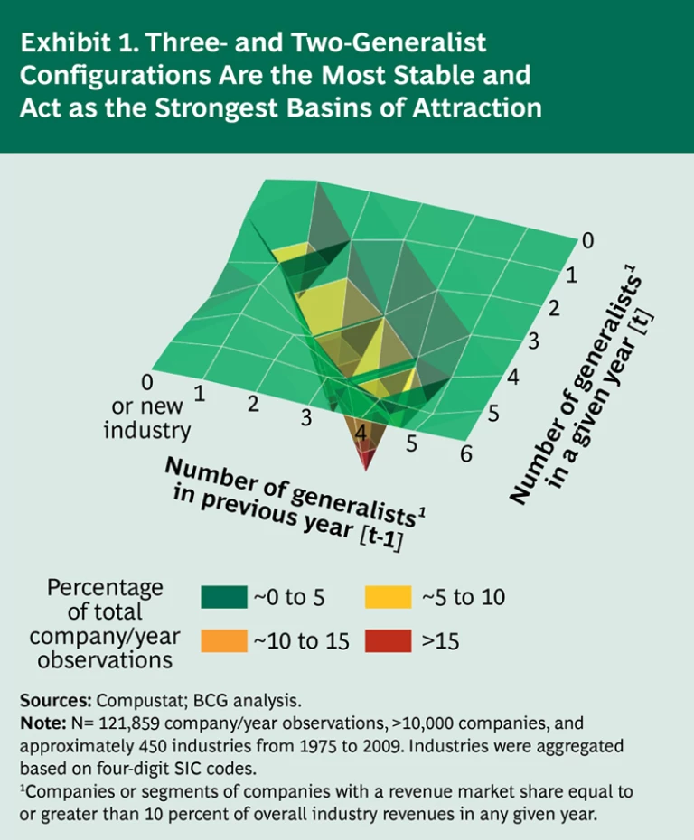 Industries with three-generalist structures have also proven the most profitable for industry participants, with an average return on assets a full 2.5 percentage points higher than in industries with four, five, or six generalists. Additionally, three- and two-generalist configurations appear to have the greatest stability and to act as the strongest “basins of attraction”—that is, more companies gravitate toward these structures every year than toward any other. (See Exhibit 1.)