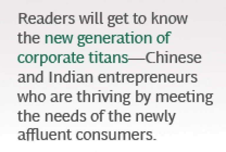 Readers will also get to know the new generation of corporate titans—Chinese and Indian entrepreneurs who are thriving by meeting the needs of the newly affluent consumers—including Frank Ning, who runs Cofco, one of the world’s biggest food processing companies; Adi Godrej, chairman of the Godrej Group, one of India’s biggest consumer goods conglomerates; and Anand Mahindra, vice chairman and managing director of Mahindra & Mahindra, India’s major manufacturer of tractors and low-cost—and now global—sport utility vehicles.