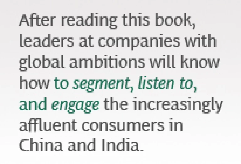 We hope you use this book to see the market opportunity in China and India through the eyes of consumers moving from D income to C income, from C income to B income, and from B income to A income. We offer a checklist of requirements for success along with our assessment of risks and how to mitigate them.After reading this book, leaders at companies with global ambitions will know how to segment, listen to, and engage the increasingly affluent consumers in China and India. It is easy to be swayed by the sheer number of consumers in the two countries and to think that success is just a matter of selling to a small fraction of them. But averages can be deceptive, and off-the-shelf statistics and generalized data can lead companies into making bad decisions and expensive mistakes.