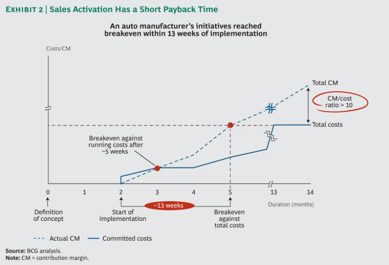 Because of this active engagement and rapid follow-up, the manufacturer was able to quickly determine which pilots were successful. Five months after launching the sales activation effort, and just 13 weeks into the pilots themselves, the initiatives reached the breakeven point. (See Exhibit 2.) The manufacturer then rolled out the pilots to the full dealer network. After 14 months, the initiatives had delivered ten times their total investment and provided the company with a much-needed boost in revenues. The focus on targeted and diligent lead management paid off.