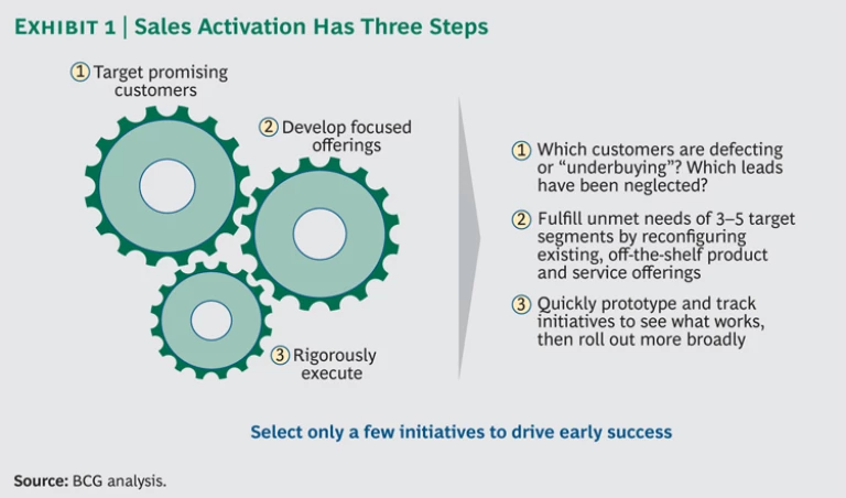 To activate sales in the short term, we have found that the best approach is to focus on and leverage existing customers, products, and salespeople rather than embarking on long-term product-development or restructuring efforts. Although those more fundamental efforts often become complementary next steps to a sales activation effort, they rarely deliver the rapid results that are needed to meet near-term sales targets. Once near-term targets have been met, the additional revenue from sales activation can often fund a longer-term sales-force transformation.