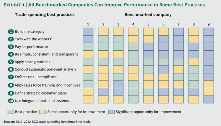 To gain insights into benchmarks and best practices, The Boston Consulting Group recently surveyed nine U.S. consumer-products companies. We gathered data on gross revenues, unit volume, and trade spending over time. To understand design and execution choices, we interviewed leaders of sales, sales finance, and trade marketing, as well as leaders of trade strategy and execution. This allowed us to identify ten best practices for trade spending. Performance varied considerably among the benchmarked companies with respect to these practices. We found that all of the companies had opportunities to improve their performance in at least some of the best practices; no company had a “perfect” program. (See Exhibit 1.)