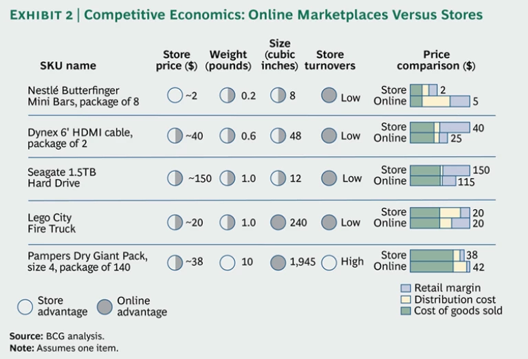 Despite their rapid rise, marketplaces have yet to take off in all categories. They have proved most effective for slower-moving lightweight products that cost $20 or more, where consumers value broad assortments and low prices. These include such categories as media, consumer electronics, and general merchandise (home office equipment, toys, and small appliances), in which the cost tradeoffs between distribution through stores (where retailers pay for rent and labor) and home delivery (where retailers pay for the cost of picking and packing and transportation) favor marketplaces. (See Exhibit 2.)