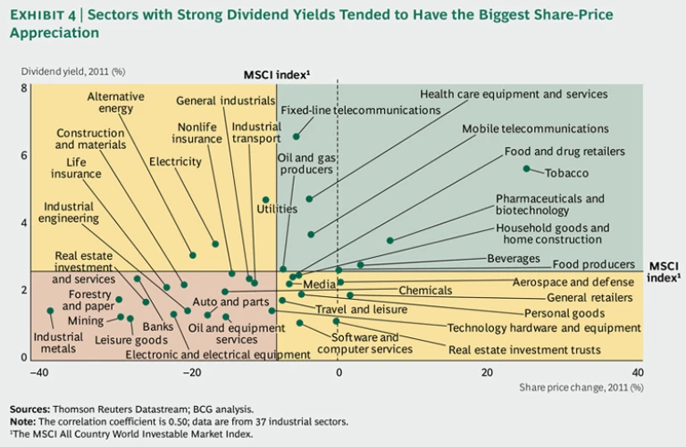 But higher dividend payouts, in addition to directly creating shareholder value, can have a major positive impact on a company’s multiple. Exhibit 4 compares the 2011 dividend yield in our 37 industry sectors (on the y-axis) with the change (positive or negative) in the price of shares in each sector (on the x-axis). The exhibit illustrates that many of the sectors with the highest yields were also those with the strongest share-price appreciation.