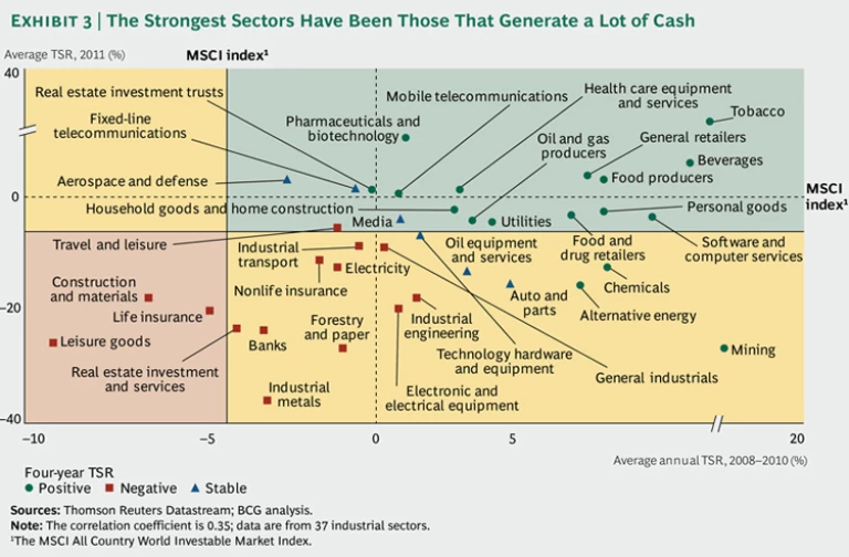 The robustness of the cash machine strategy for value creation in 2011 was also reflected in the sector results. (See Exhibit 3.) The strongest sectors in 2011 were tobacco (a TSR of 30 percent) and pharmaceuticals and biotechnology (10 percent), which explains, in part, the presence of Bristol-Myers Squibb (number four) and Pfizer (number seven) on the list. Other relatively stable, cash-generating sectors, such as beverages, general retailers, and food producers, also performed well. And even some cash-generating sectors that globally did not create value in 2011, such as utilities and personal goods, were still able to retain a positive TSR for the four years since the 2008 financial crisis.