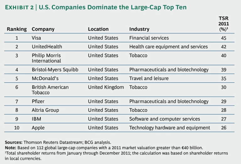 In 2010, developed-world multinationals took seven of the ten places on our top-ten list of single-year large-cap value creators. We speculated that this performance signaled a “return to quality”—that is, a tendency on the part of global investors to focus on established companies with strong cash flows, clear sources of competitive advantage, and high-quality management teams. In 2011, that trend continued, with developed-world multinationals taking all ten spots on the list. The big difference this year: all but one—British American Tobacco (number six)—are based in the U.S. (See Exhibit 2.)