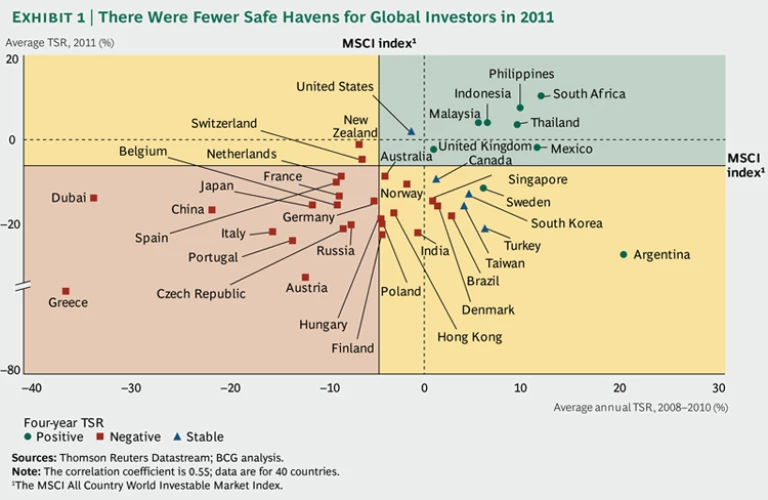 - Broad declines in TSR meant that there were far fewer safe havens for investors. The equity markets of only 6 countries out of the 40 covered by the MSCI index delivered positive TSR in 2011. And only a quarter of the 37 industry sectors did so.