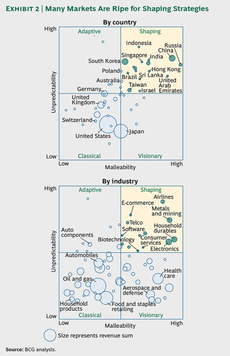 Conditions in many markets today lend themselves to shaping strategies. Unpredictability is rising, driven by globalization, ongoing advances in technology, increased transparency, and other factors. Simultaneously, many markets are becoming more malleable. High growth rates and fragmentation in new markets create opportunities to deploy new business models. Technological change creates opportunities for disruptive innovation. Demographic shifts create new markets whose development can be influenced. As governments wrestle with these dynamics, there is also potential for companies to shape regulation.
