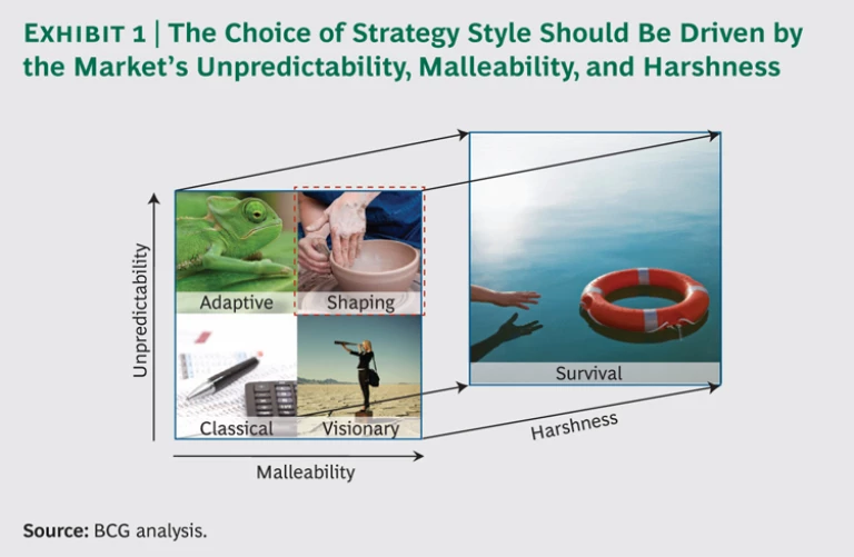 Shaping is one of five fundamentally distinct strategy styles or approaches to strategy. Like the others—classical, adaptive, visionary, and survival—it is suited to specific market environments. (For a full discussion of these styles, see “Your Strategy Needs a Strategy,” BCG article, October 2012.) A company’s choice of style should ultimately be driven by three factors: a market’s unpredictability, malleability (that is, the degree to which a company can influence competitive forces), and harshness. (See Exhibit 1.)