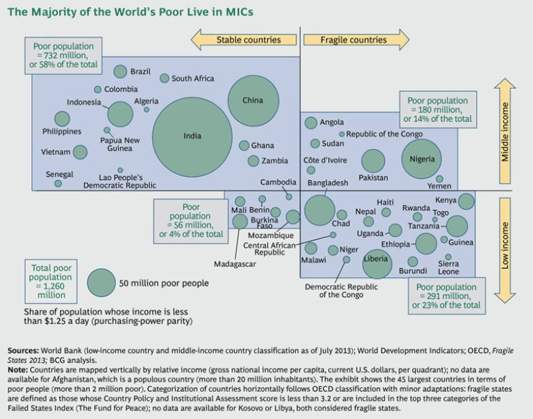 Rapid economic growth in the developing world has turned many once-poor nations such as China, India, Brazil, and Indonesia into middle-income countries (MICs), defined by the World Bank as countries whose annual per capita gross national income ranges from $1,026 to $12,475. With relatively stable governments and growing financial resources, these countries receive less international aid now that they’ve ascended the economic ladder. That is not to say that their social problems have disappeared. Far from it. In fact, despite their relative economic progress, MICs are now home to 72 percent of the world’s poorest people. (See the exhibit below.) Income inequality and growing urban poverty are enormous challenges.